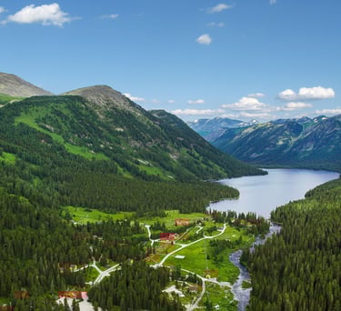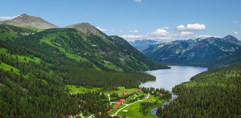 Surrounded by majestic pine trees, this eco lodge immerses you in the serene beauty of the Altai mountains, providing a perfect retreat for nature lovers seeking tranquility and stunning landscapes.